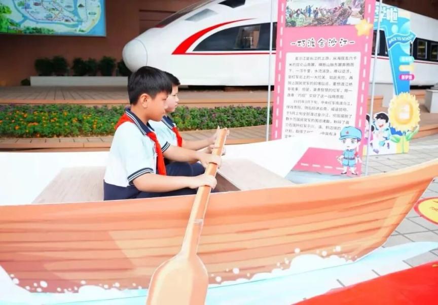 福建省福州金山小学开学典礼策划了“小小红军重走长征路”活动。从校门口到教室,孩子们沿着“瑞金出发”“巧渡金沙江”“飞夺泸定桥”等关卡,沉浸式体验红色场景。